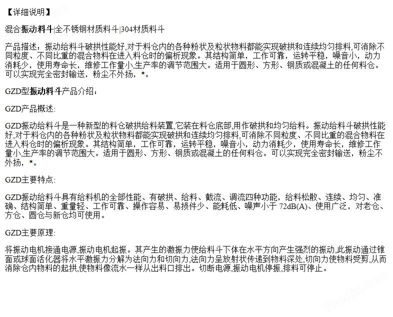 將振動(dòng)由機(jī)接通由源攝動(dòng)由機(jī)起振。且產(chǎn)生的激振力使給料斗下體在水平方向產(chǎn)生強(qiáng)列的振動(dòng)此振動(dòng)通過錐面或球面活化器將水平激振力分解為法向力和切向力法向力呈放射狀傳遞到物料深處切向力使物料受剪從而消除倉內(nèi)物料的起拱使物料像流水一樣從出料口排出。切斷電源振動(dòng)電機(jī)停振排料可停止。