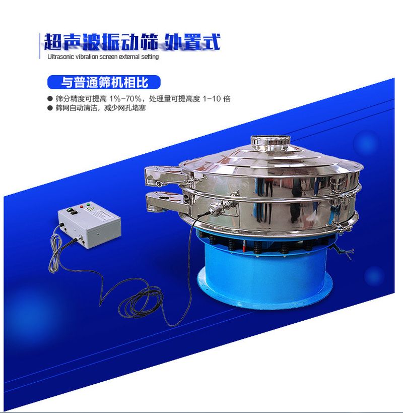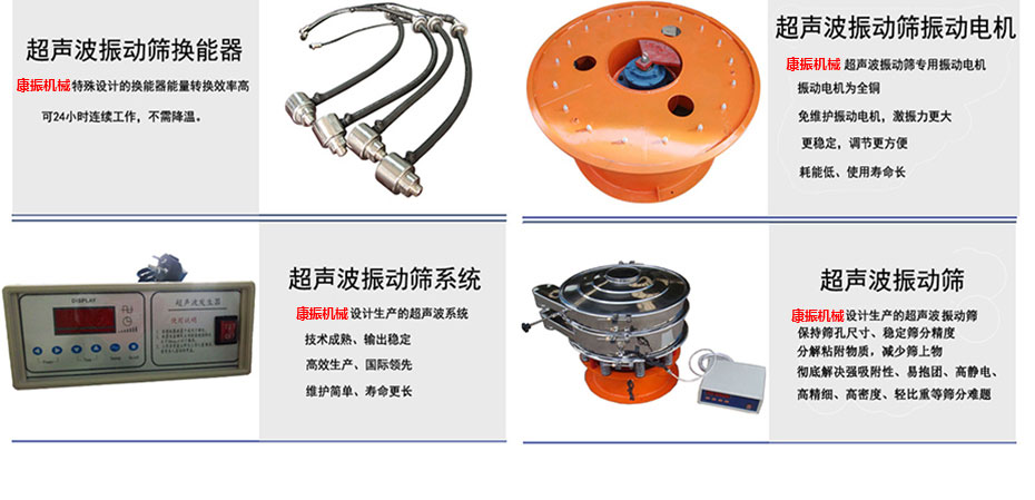超聲波振動篩是將220V、50Hz或110V、60Hz電能轉(zhuǎn)化為36KHz的高頻電能,輸入超聲換能器,將其變成36KHz機械振動,產(chǎn)生的功率超聲波使篩網(wǎng)作高頻振動。篩網(wǎng)上的物料在作低頻旋振運動的同時,疊加上超聲振動,既可防止網(wǎng)孔堵塞,又可使篩分機提高產(chǎn)量和質(zhì)量,從而達到快速篩分和清網(wǎng)的目的,使超微細粉篩分成為易事。該系統(tǒng)在傳統(tǒng)的振動篩基礎(chǔ)上在篩網(wǎng)上引入一個低振幅、高頻率的超聲振動波(機械波),以改變超微細分體的篩分性能。特別適合高附加值精細分體的用戶使用。
