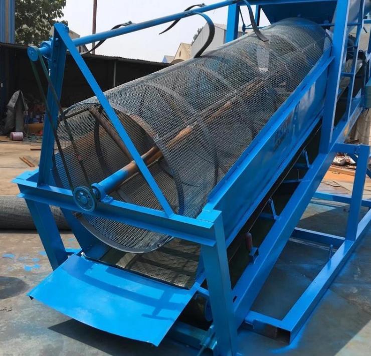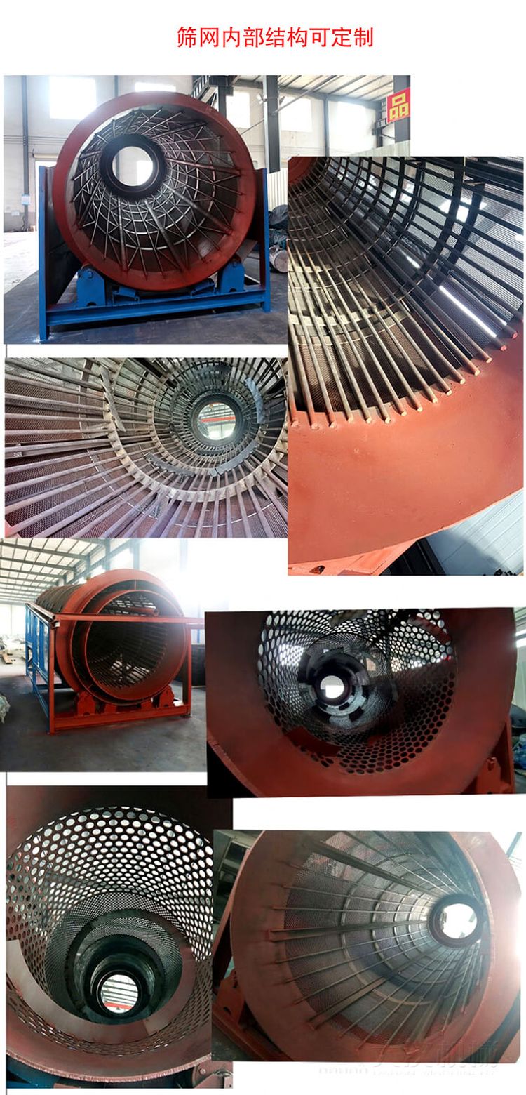 當(dāng)物料進(jìn)入重型滾筒篩內(nèi)部篩網(wǎng)時(shí),由于滾筒裝置的傾斜與轉(zhuǎn)動(dòng),使篩面上的物料翻轉(zhuǎn)與滾動(dòng),使合格物料(篩下產(chǎn)品)經(jīng)滾筒外圓的篩網(wǎng)排出,不合格的物料(篩上產(chǎn)品)經(jīng)滾筒末端排出。由于物料在滾筒內(nèi)的翻轉(zhuǎn),滾動(dòng),使卡在篩孔中的物料可被彈出,防止篩孔堵塞。