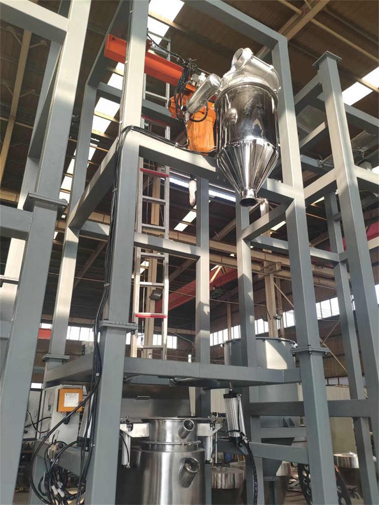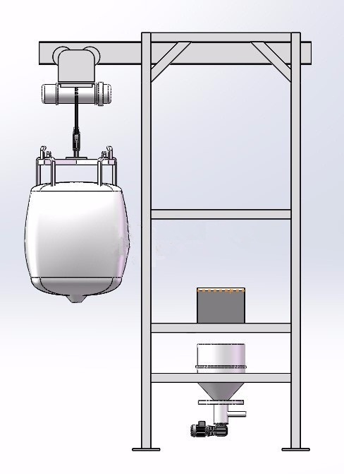 噸包投料站又稱噸袋拆包機(jī),是用來實現(xiàn)袋裝散裝物料的卸料功能,為半自動操作。包裝袋由電動葫蘆提升,包裝袋的袋繩掛在鋼性支架上,手動操作控制葫蘆升降和行走,沿著行走導(dǎo)軌運(yùn)行到卸料區(qū)上方落下,將包裝袋放置在支架托盤上,使大袋處于卸料位置。然后手動打開卸料閥操作門,人工將包裝袋的卸料口拉入到卸料閥的系口出,按下系帶按鈕,卸料閥束緊氣缸將袋口鎖緊,再手動將大袋的卸料口從卸料位置拉下,罩在卸料口密封箱內(nèi)的出料管外側(cè),按下壓袋機(jī)構(gòu)氣動控制開關(guān),使密封法蘭下降,并緊壓在出料管的管端,密封卸料通道,以防卸料過程中粉塵漏,接著,人工解袋,關(guān)上操作門。手動開啟與卸料口密封箱連接的通風(fēng)除塵管道上的閥門。至此,卸料準(zhǔn)備過程結(jié)束。