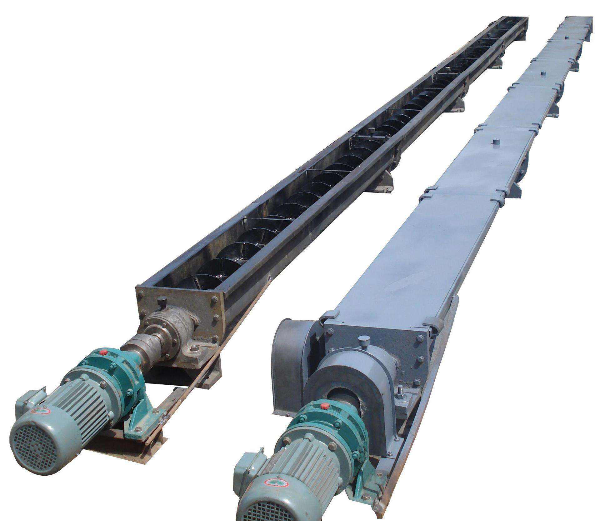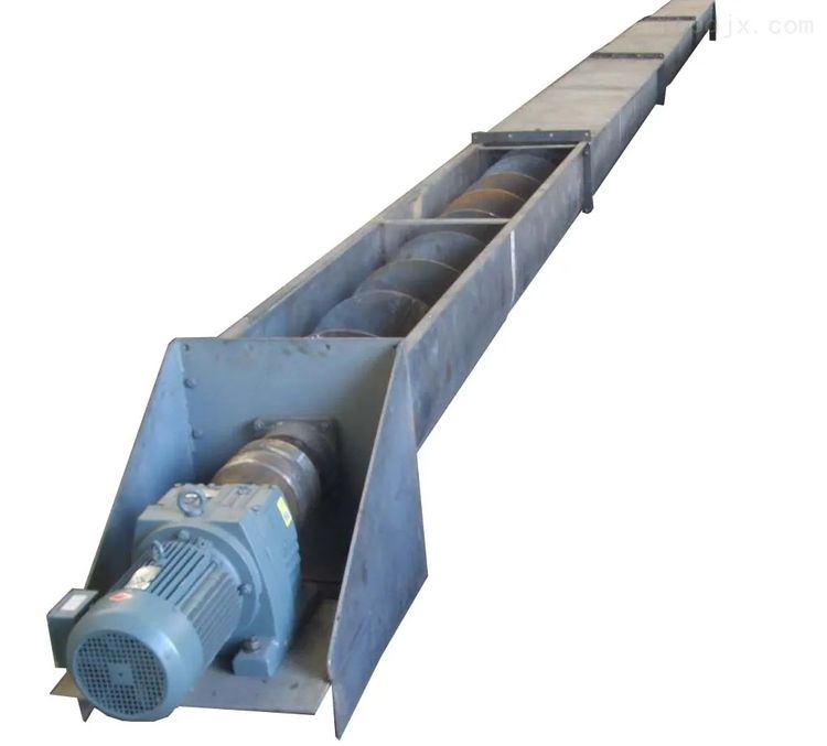 LS型螺旋輸送機結構特征,一臺螺旋輸送機通常由本體、進出裝置、驅動裝置三大部分組成。本體由首節(jié)、中間節(jié)、尾節(jié)三種組成。在首節(jié)內(nèi)裝有支推軸承承受軸向力,在中間節(jié)和尾節(jié)內(nèi)裝有用軸承支承螺旋軸,此外,在尾節(jié)內(nèi)還裝有可軸向移動的徑向軸承以補償螺旋軸長度的誤差和適應溫度的變化。各螺旋軸之間采用法蘭式聯(lián)接,提高聯(lián)接軸的互換性,便于維修。