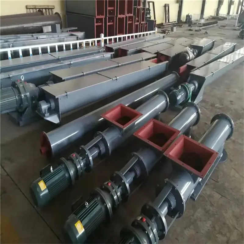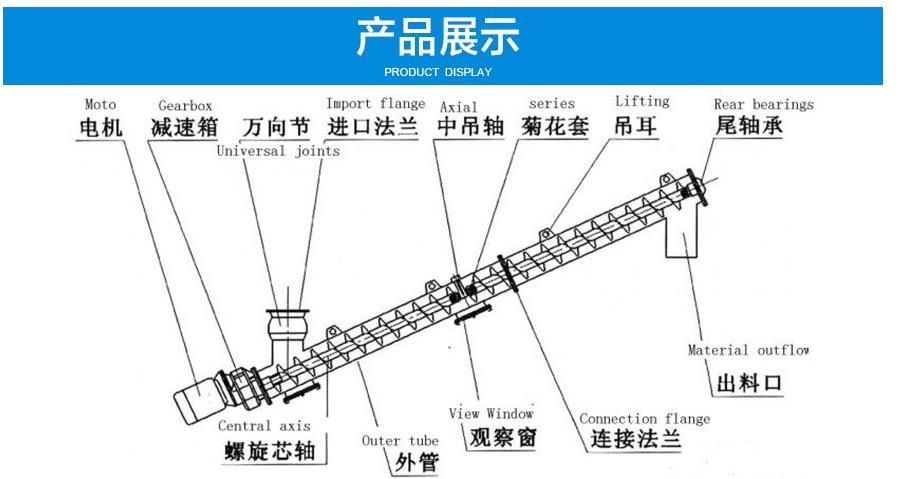 LS型螺旋輸送機是利用旋轉的螺旋將被輸送的物料沿固定的機殼內(nèi)推移而進行輸送工作,頭部及尾部軸承移至殼體外,吊軸承采用滑動軸承設有防塵密封裝置,軸瓦一般采用粉末冶金,輸送水泥采用毛氈軸瓦,吊軸和螺旋軸采用滑塊連接。