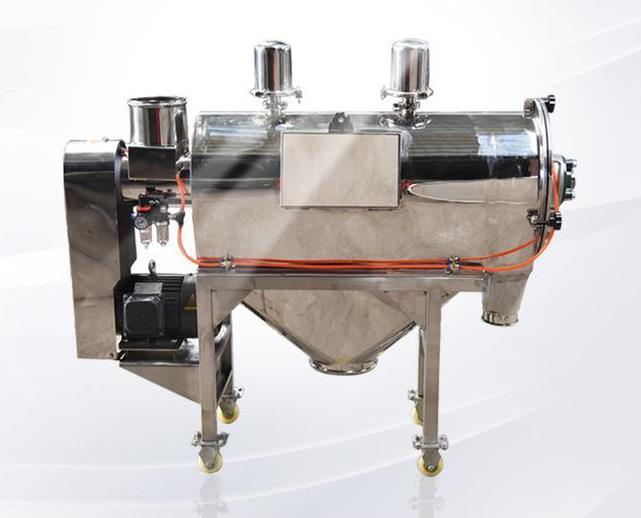 臥式氣流篩篩網(wǎng)為圓筒狀,置于機體內,物料通過螺旋輸送系統(tǒng)后,和氣流混合、霧化進入網(wǎng)筒內;