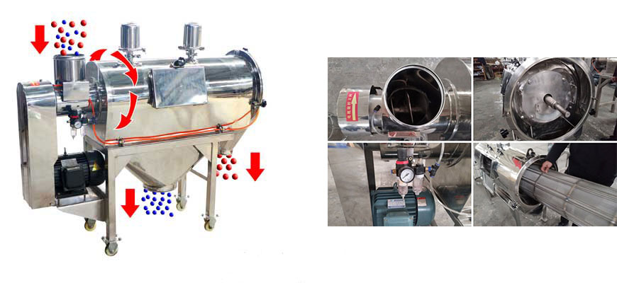 本設備篩網(wǎng)為圓筒狀,置于機體內,物料通過螺旋輸送系統(tǒng)后與氣流混合、霧化進入網(wǎng)筒內,