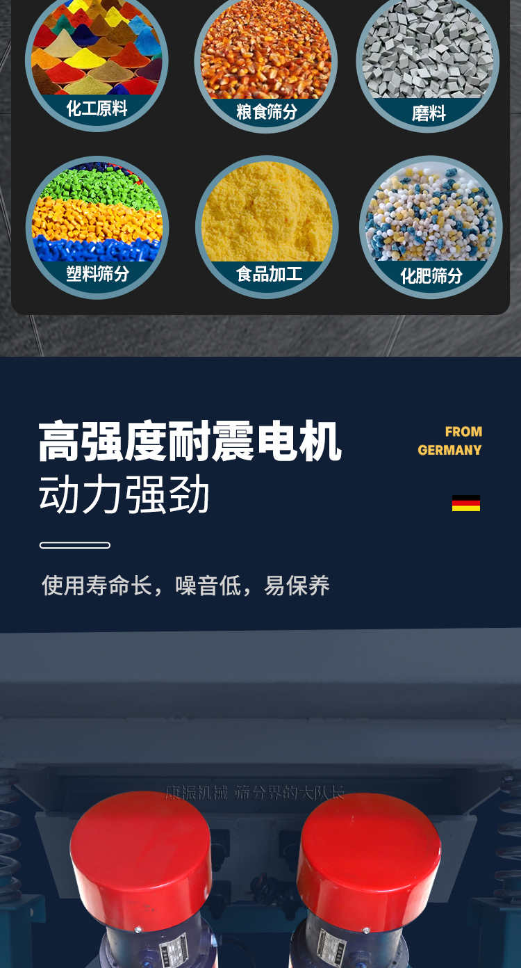 是以利用振動電機激振作為振動源,使物料在篩網(wǎng)上被拋起,同時受力向前做直線規(guī)則運動,物料從給料機均勻地進入篩分機的進料口,通過多層篩網(wǎng)產(chǎn)生數(shù)種規(guī)格的篩上物、篩下物、從各自的出口排出。具有耗能低、產(chǎn)量高、結(jié)構(gòu)簡單、易維修、全封閉結(jié)構(gòu),無粉塵溢散,自動排料, 更適合于高產(chǎn)能流水線作業(yè)。