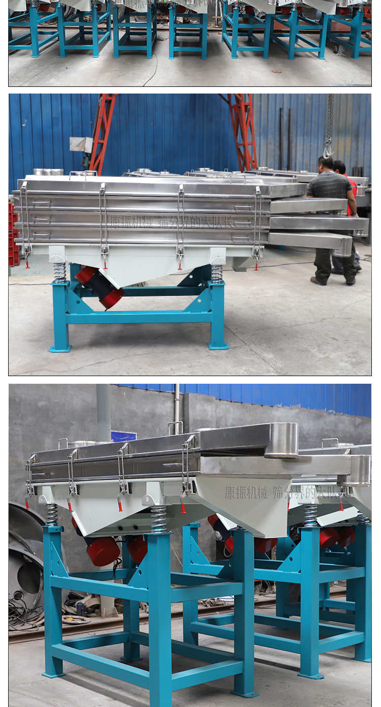 直線振動篩利用振動電機激振作為振動源,使物料在篩網(wǎng)上被拋起,同時向前作直線運動,物料從給料機均勻地進入篩分機的進料口,通過多層篩網(wǎng)產(chǎn)生數(shù)種規(guī)格的篩上物、篩下物、分別從各自的出口排出。具有耗能低、產(chǎn)量高、結(jié)構(gòu)簡單、易維修、全封閉結(jié)構(gòu),無粉塵溢散,自動排料,更適合于流水線作業(yè)。