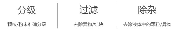 任何顆粒、粉末、粘液一定范圍內(nèi)均可篩選。篩分細(xì)至500目或0.028mm, 過(guò)濾小可至5微米。分級(jí)篩選,可篩一至五層篩網(wǎng),能同時(shí)進(jìn)行二至六個(gè)等級(jí)的分選或過(guò)濾。