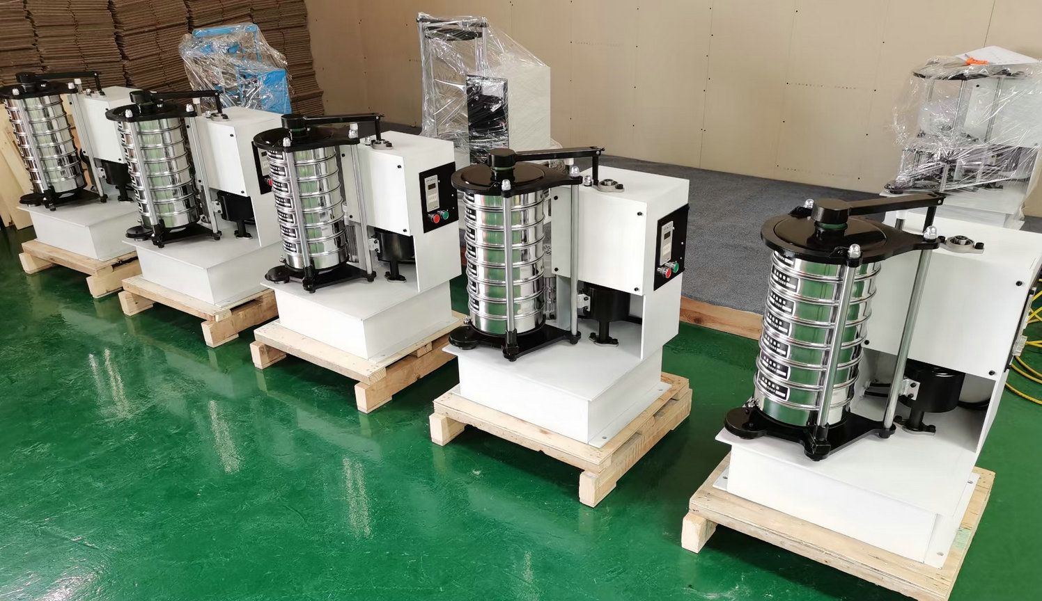 3. 把標(biāo)準(zhǔn)篩框按孔徑從小到大,從下到上依次疊放到篩框底座上。