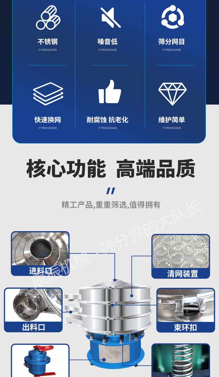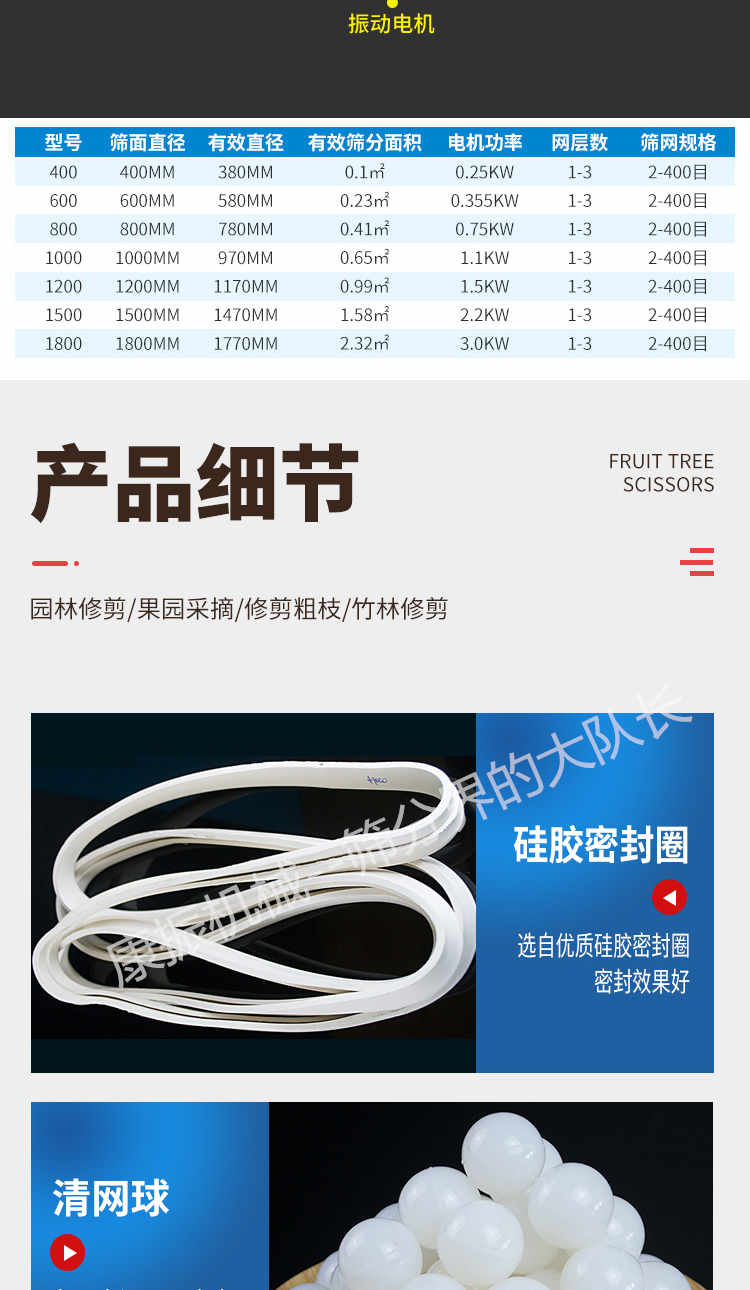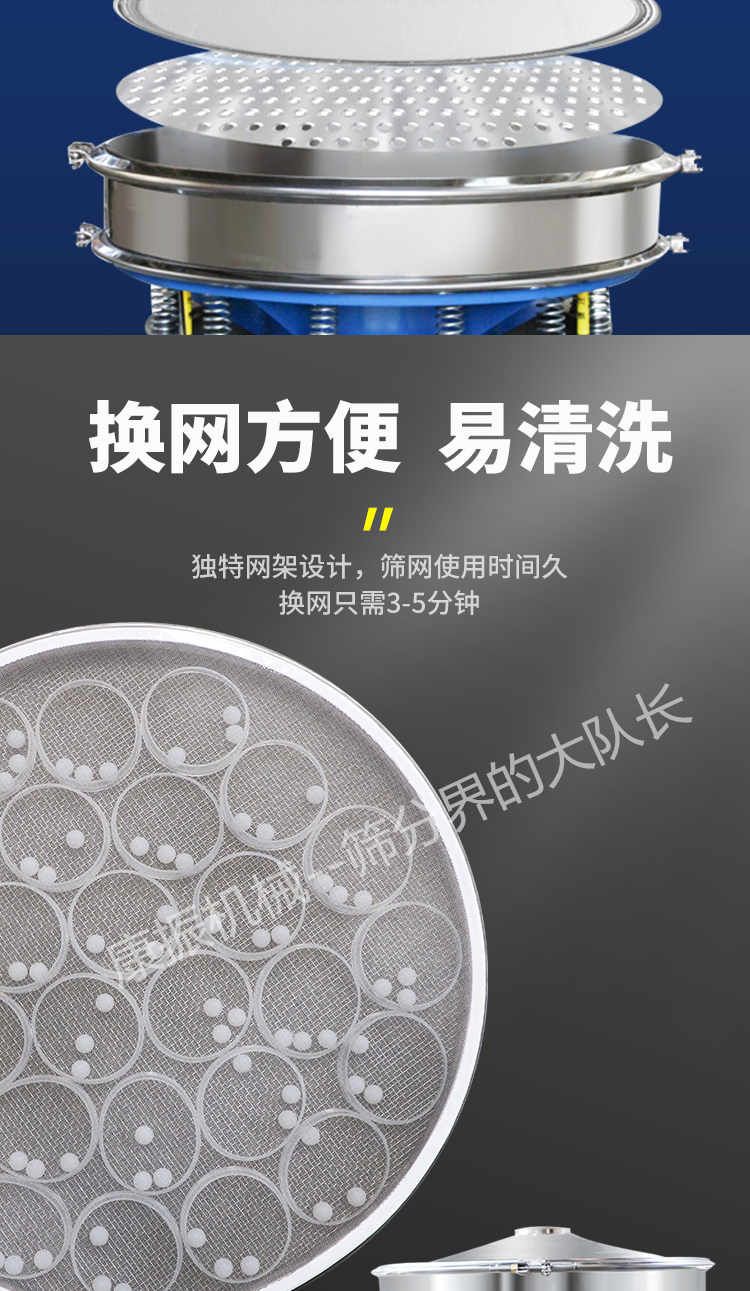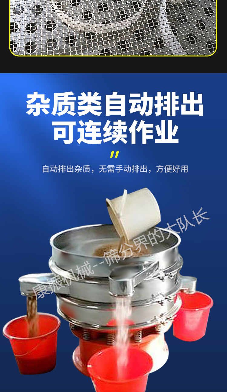 篩選范圍廣--只有系列三次元旋振篩能分選如此廣的原料范圍:任何顆粒、細(xì)粉、漿液都可以篩選。篩分細(xì)500目(28微米),過(guò)濾細(xì)5微米。網(wǎng)孔防堵塞--三次元振動(dòng)功能及自動(dòng)清理堵網(wǎng)裝置把堵網(wǎng)幾率降到小。 單層或多層分選--每臺(tái)旋振篩可選一至五層篩網(wǎng),能同時(shí)進(jìn)行二到六個(gè)等級(jí)的分選或過(guò)濾。